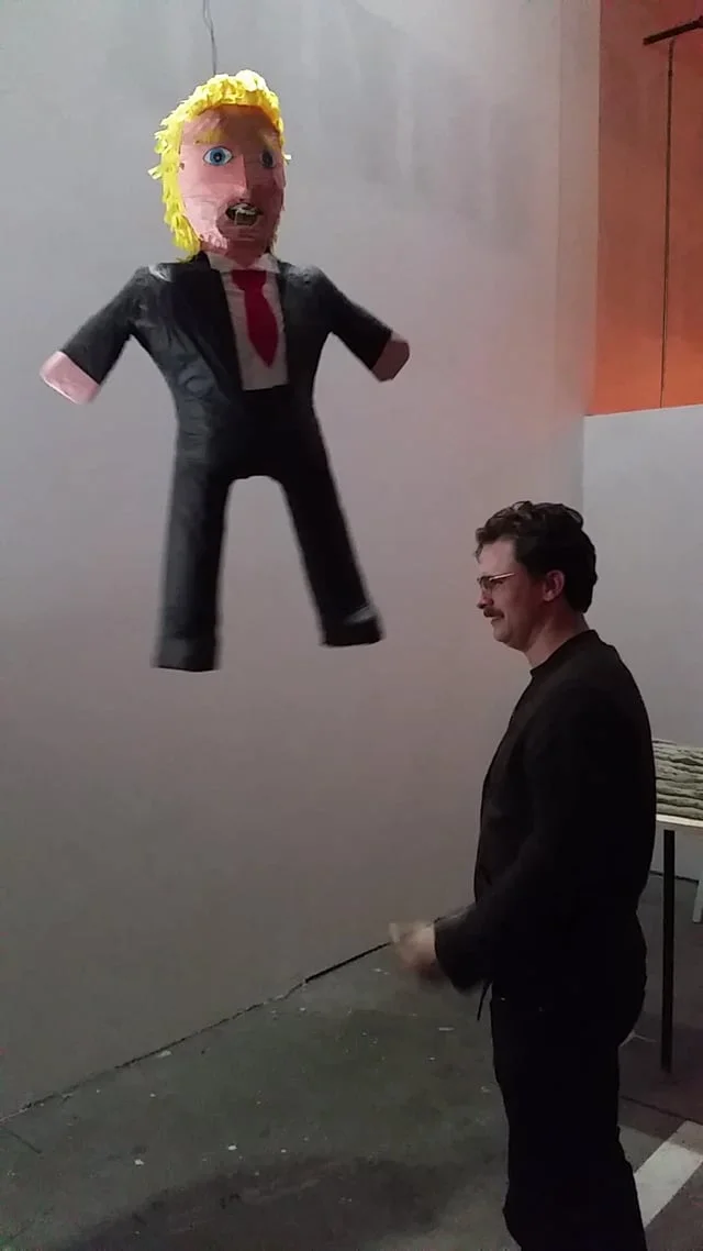 An interactive installation consisting of 100 unfired ceramic (clay) stick, a Donald Turmp piñata, and a sign with rules.